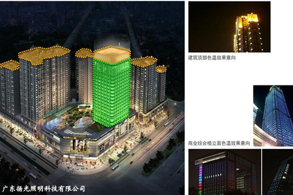商業(yè)綜合樓立面面對著人流量較多,是燈光靚現(xiàn)的重要區(qū)域。色溫可選用暖黃或彩色光體體現(xiàn)現(xiàn)代時尚感。