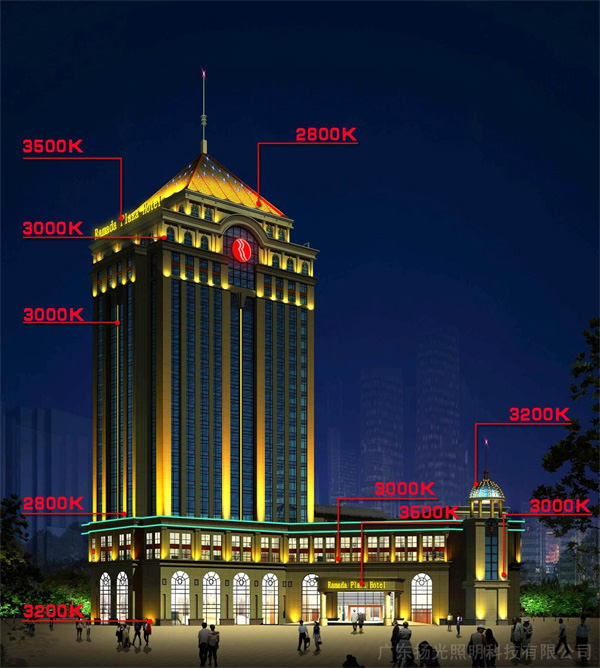 建筑整體以暖色調為主,頂部多用投光照明體現(xiàn)建筑結構與光感;立面采用埋地燈與投光燈相結合的方式營造酒店雅致而不失華麗的燈光魅力,褐樓頂部利用藍色線管勾勒輪廓,使整個人口燈光注入新穎、活潑的情調。