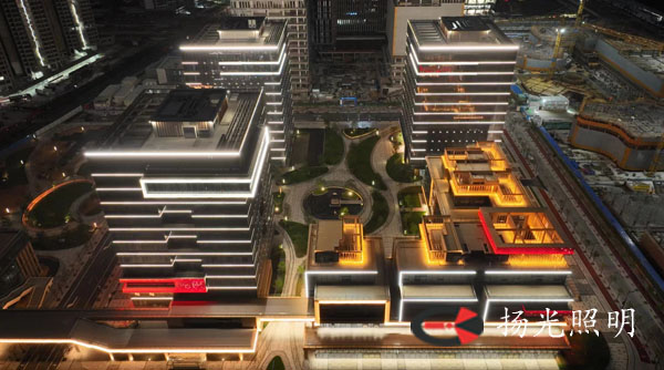 寫字樓A/C棟高層正立面橫向?qū)娱g板采用線條燈安裝于凹槽內(nèi),B棟整體及A/C棟其余立面僅僅轉(zhuǎn)角位置安裝線條燈,靜態(tài)呈現(xiàn),體現(xiàn)建筑聳立感。商業(yè)部分3-5層采用靜態(tài)常亮線條燈(暖白光),勾勒建筑輪廓,與飄帶位置燈光形成光色對(duì)比,靜態(tài)呈現(xiàn)。