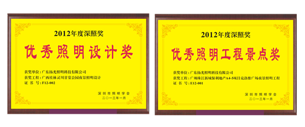 2013年1月6日,由深圳市照明學(xué)會(huì)和深圳市照明電器行業(yè)協(xié)會(huì)根據(jù)深圳市照明行業(yè)發(fā)展共同設(shè)立的深照獎(jiǎng)舉行了頒獎(jiǎng),揚(yáng)光照明囊獲優(yōu)秀照明工程景點(diǎn)獎(jiǎng)和優(yōu)秀照明設(shè)計(jì)獎(jiǎng)兩項(xiàng)大獎(jiǎng)。