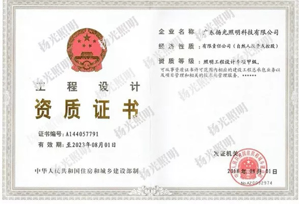 近日,揚(yáng)光照明成功取得了由國(guó)家住房與城鄉(xiāng)建設(shè)部頒發(fā)照明工程設(shè)計(jì)專(zhuān)項(xiàng)資質(zhì)甲級(jí),至此,公司已成為全國(guó)為數(shù)不多的城市及道路照明工程施工壹級(jí),照明工程設(shè)計(jì)專(zhuān)項(xiàng)資質(zhì)甲級(jí)的“雙甲”企業(yè),“雙甲”資質(zhì)的取得體現(xiàn)了行業(yè)和市場(chǎng)對(duì)公司綜合實(shí)力的高度認(rèn)可,意味著可以承接任何規(guī)模的照明設(shè)計(jì)與施工項(xiàng)目。