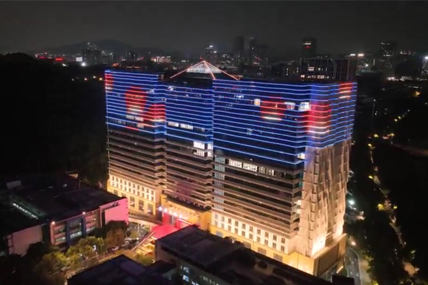 建筑頂部幕墻采用 RGBW 全彩燈光,通過(guò)智能控制,以立面動(dòng)態(tài)圖案與定制動(dòng)畫演繹企業(yè)形象,吸引多視角關(guān)注,深化企業(yè)品牌辨識(shí)度;控制系統(tǒng)設(shè)置平日、節(jié)假日模式,可根據(jù)不同節(jié)日定制專屬光影內(nèi)容,并與廣場(chǎng)噴泉實(shí)現(xiàn)光影聯(lián)動(dòng),營(yíng)造不同的場(chǎng)景氛圍。樓身則以大功率燈光做整體烘托,通過(guò)光影塑造建筑體量,強(qiáng)化空間視覺(jué)存在感。